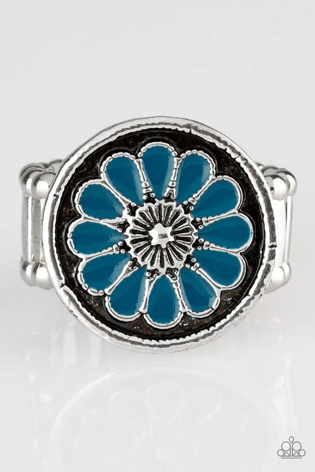 Brushed in an antiqued shimmer, refreshing blue petals spin into a whimsical floral pattern atop the finger. Features a stretchy band for a flexible fit. Sold as one individual ring.