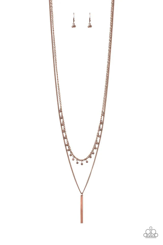 Two mismatched copper chains layer down the chest. Dainty copper beads dangle from the bottom of the uppermost chain, while a rectangular pendulum-like pendant swings from the lowermost chain for a causal finish. Features an adjustable clasp closure. Sold as one individual necklace. Includes one pair of matching earrings.