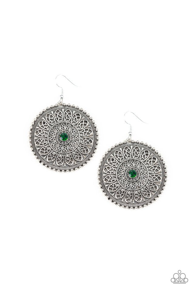 A dainty green rhinestone is pressed into the center of a round silver frame radiating with ornate petals, creating a frilly frame. Earring attaches to a standard fishhook fitting. Sold as one pair of earrings.