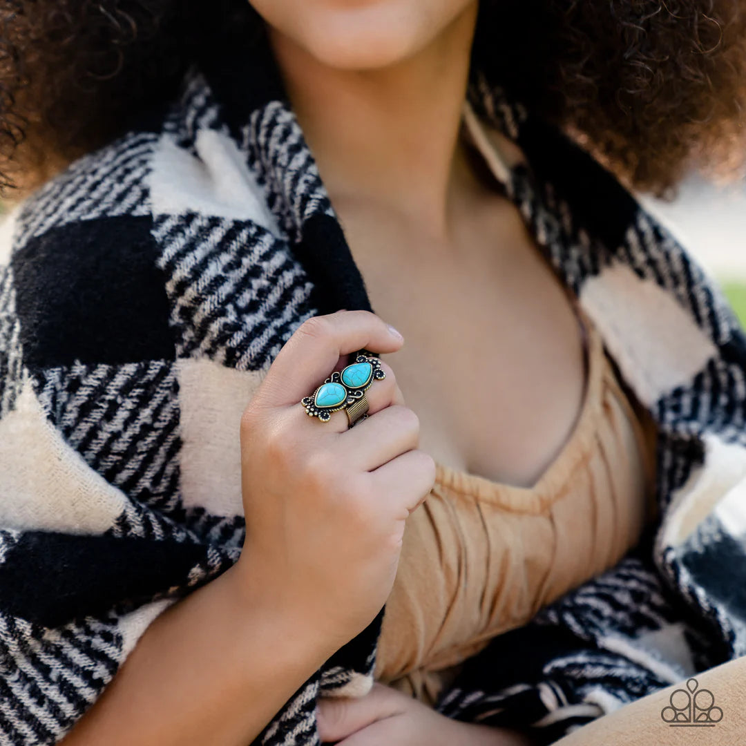 Enhanced with brass ropelike filigree and studded floral details, a pair of turquoise stone teardrops point away from each other atop a ribbed brass band for an authentically artisan style. Features a stretchy band for a flexible fit.