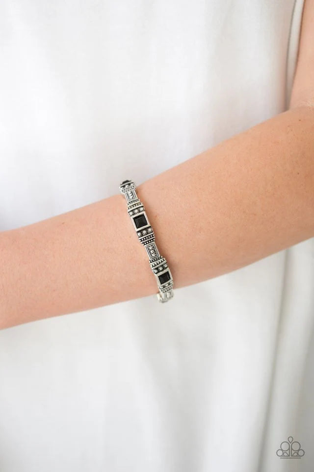 Featuring square black beads, studded silver frames are threaded along a stretchy band around the wrist for a seasonal look. Sold as one individual bracelet.