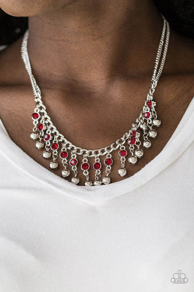 Fiery red rhinestones drip from the bottom of a bold silver chain. Classic silver beads swing from the bottoms of the glittery rhinestones, creating a glamorous fringe below the collar. Features an adjustable clasp closure. Sold as one individual necklace. Includes one pair of matching earrings.