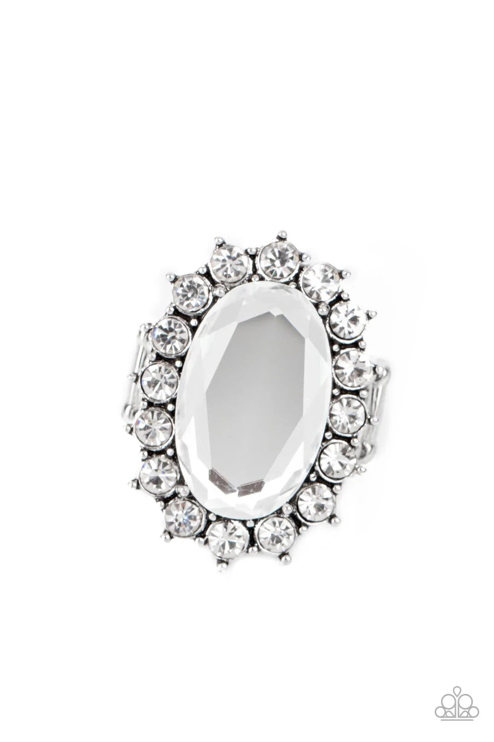 White rhinestone encrusted petals bloom from an oversized white gem, creating a dramatic centerpiece atop the finger. Features a stretchy band for a flexible fit.