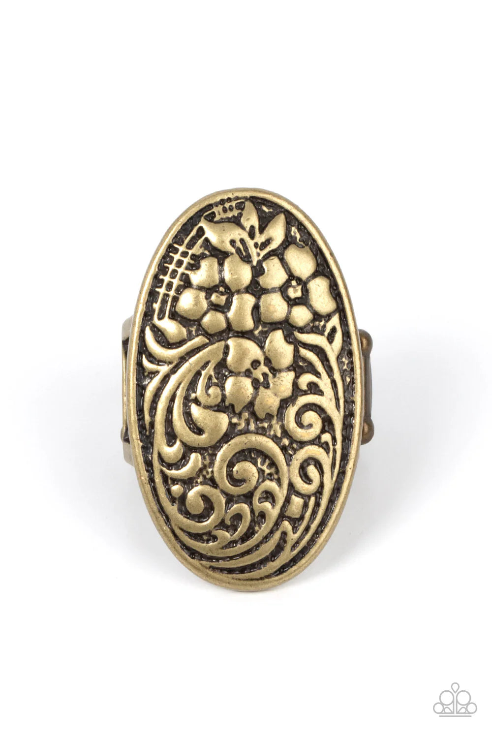 A billowing floral motif blooms across the front of a rustic brass oval frame, resulting in a seasonal centerpiece atop the finger. Features a stretchy band for a flexible fit.
