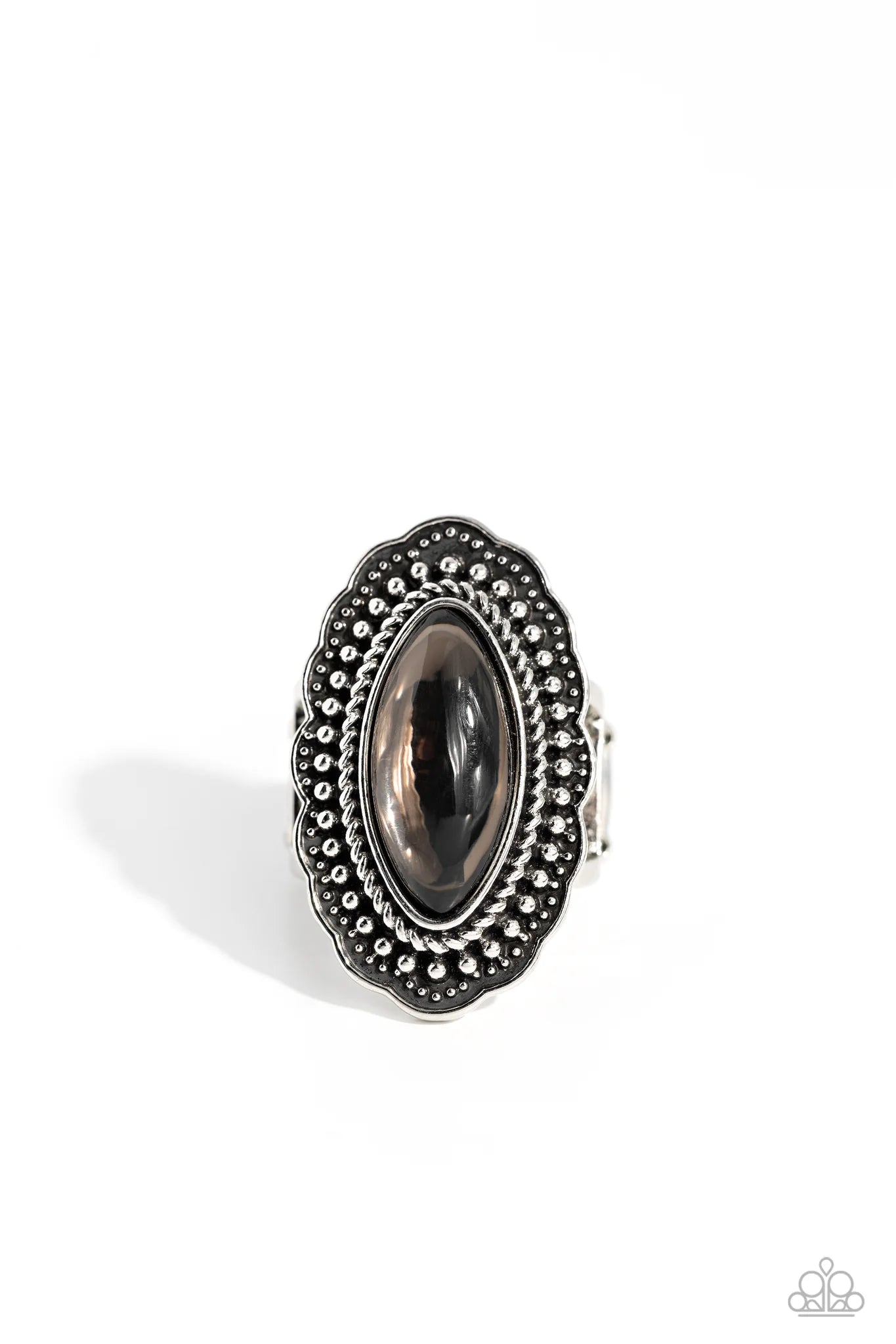 An opalescent smoky marquise-cut bead is pressed into the center of a silver floral frame radiating with studded antiqued textures. Features a stretchy band for a flexible fit.