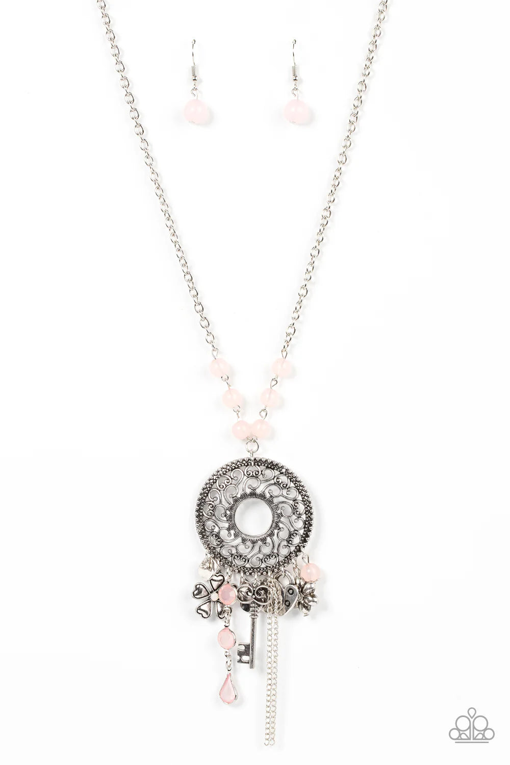 Infused with glassy Pale Rosette beaded accents, a whimsical assortment of silver key, heart, and floral charms cascades from an oversized studded silver frame that whirls with heart shaped vine-like filigree. The ornate frame swings from the bottom of a Pale Rosette beaded silver chain, adding a flirtatious pop of color to the sensational fringe. Features an adjustable clasp closure.