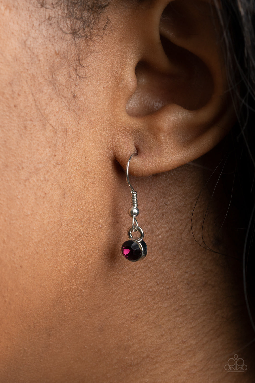 Overlapping silver rings and purple rhinestone encrusted circular frames coalesce into a glittery medallion at the bottom of a lengthened silver chain. Features an adjustable clasp closure.