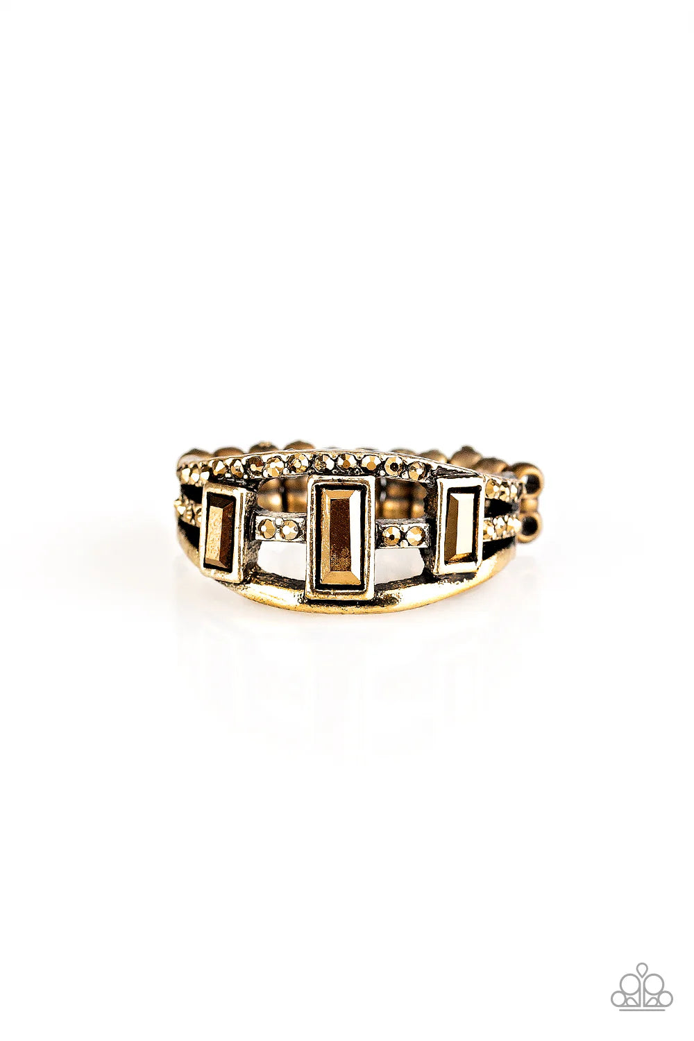 Three aurum emerald-cut rhinestones are encrusted along three brass bands radiating with smooth surfaces and sections of glittery aurum rhinestones for an edgy fashion. Features a stretchy band for a flexible fit.