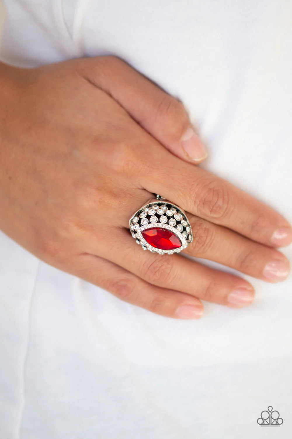 Featuring a regal marquise style cut, a fiery red rhinestone is pressed into the center of a silver frame radiating with glittery white rhinestones for a blinding finish. Features a stretchy band for a flexible fit.