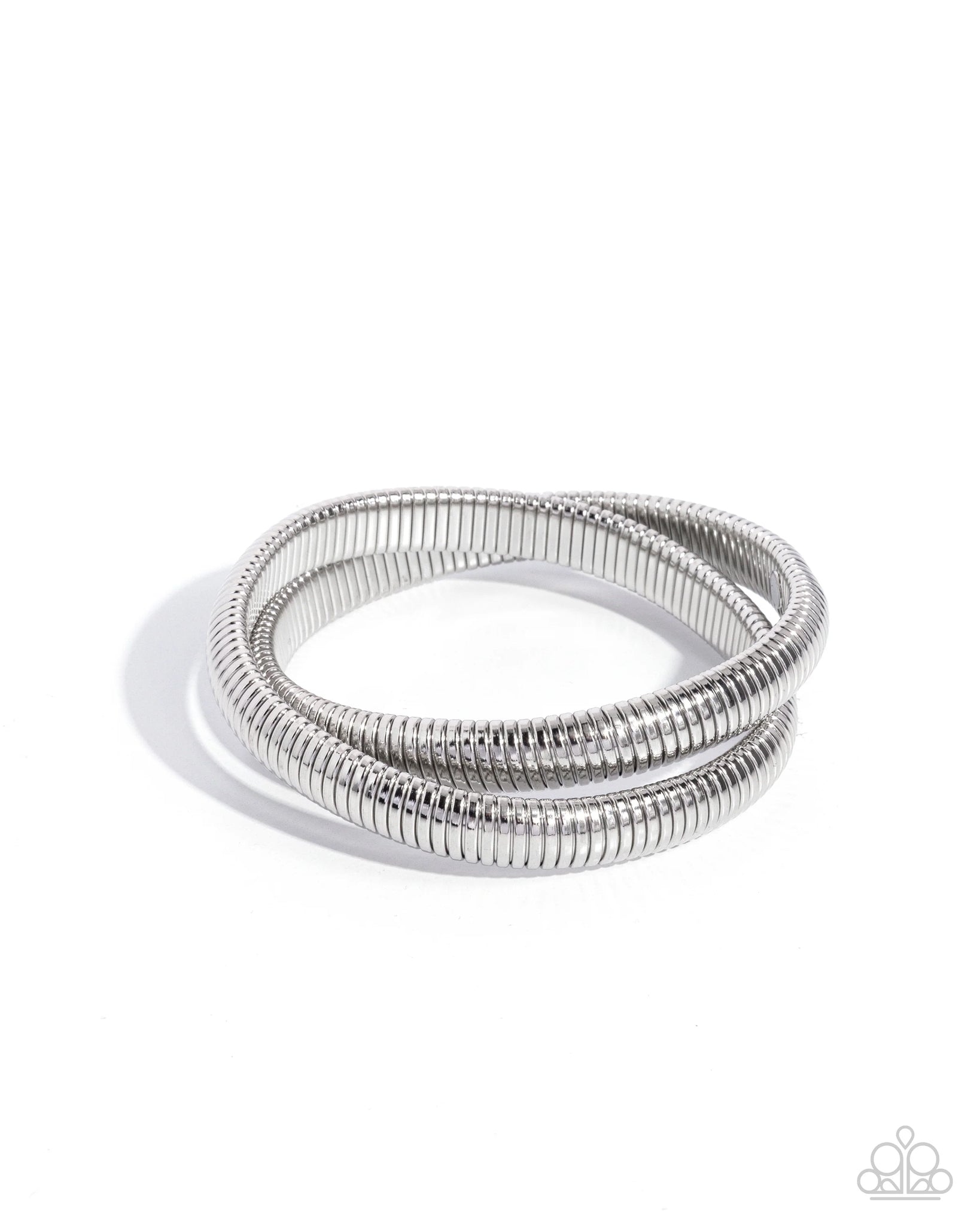 Interlocked silver frames radiating with reflective light are threaded along elastic stretchy bands around the wrist for a monochromatic, edgy stack.